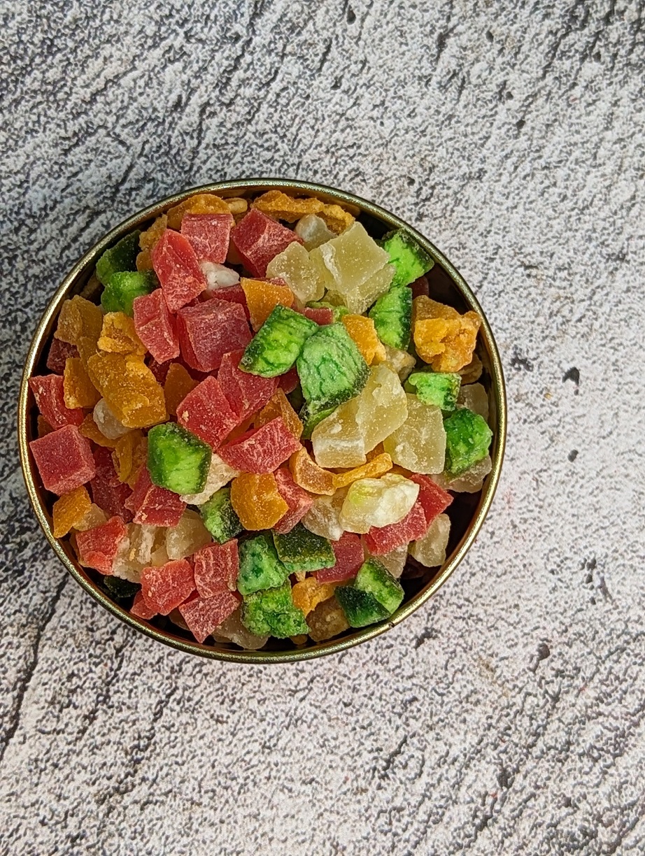 2. حبه انبه: انبه‌های خشک شده به صورت تکه‌های کوچک بریده می‌شوند و طعم استوایی و شیرینی دارند.